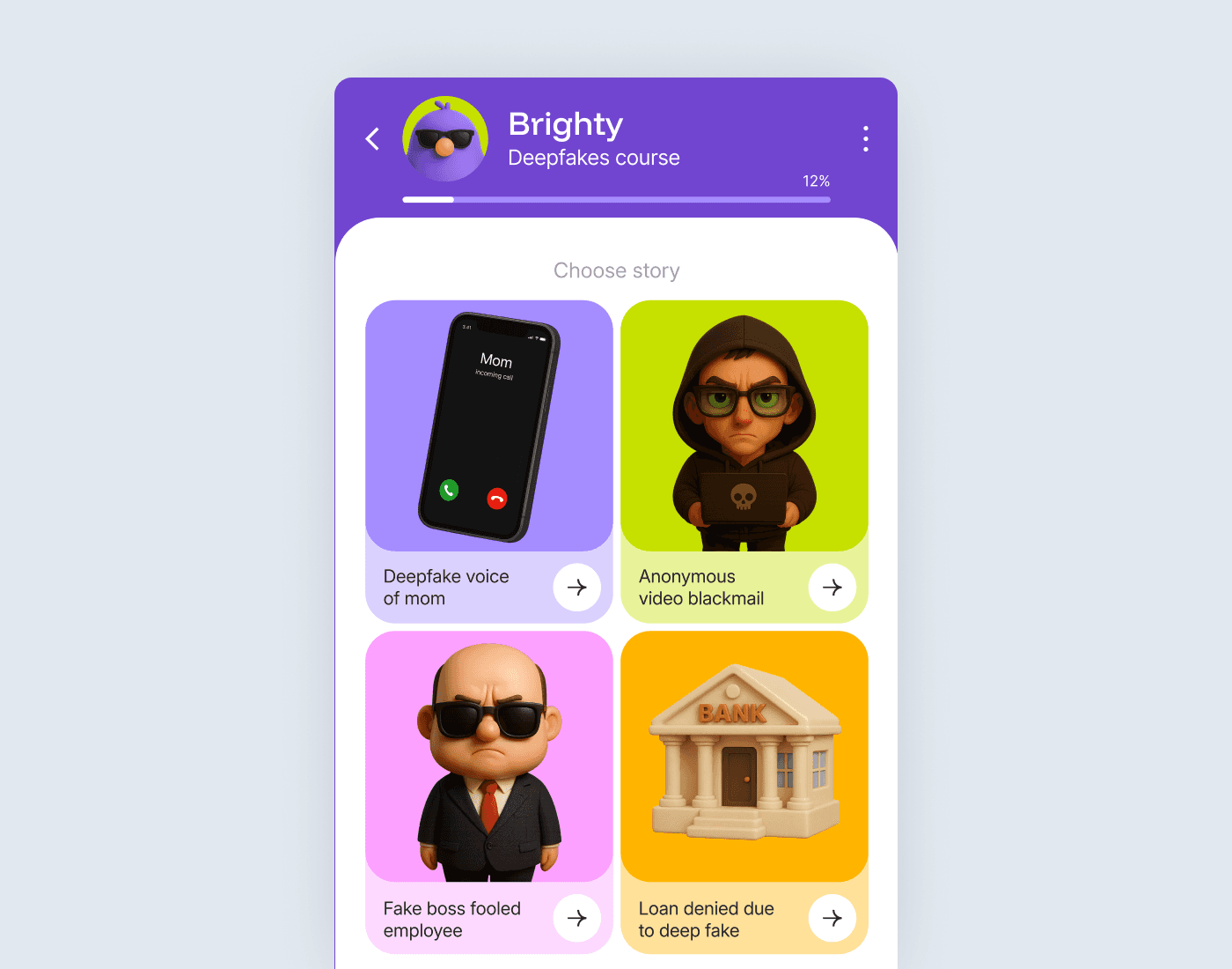 Brightside offers interactive courses ranging from basic phishing to advanced GenAI threats and deepfakes, with assignments tailored by role and simulation results.