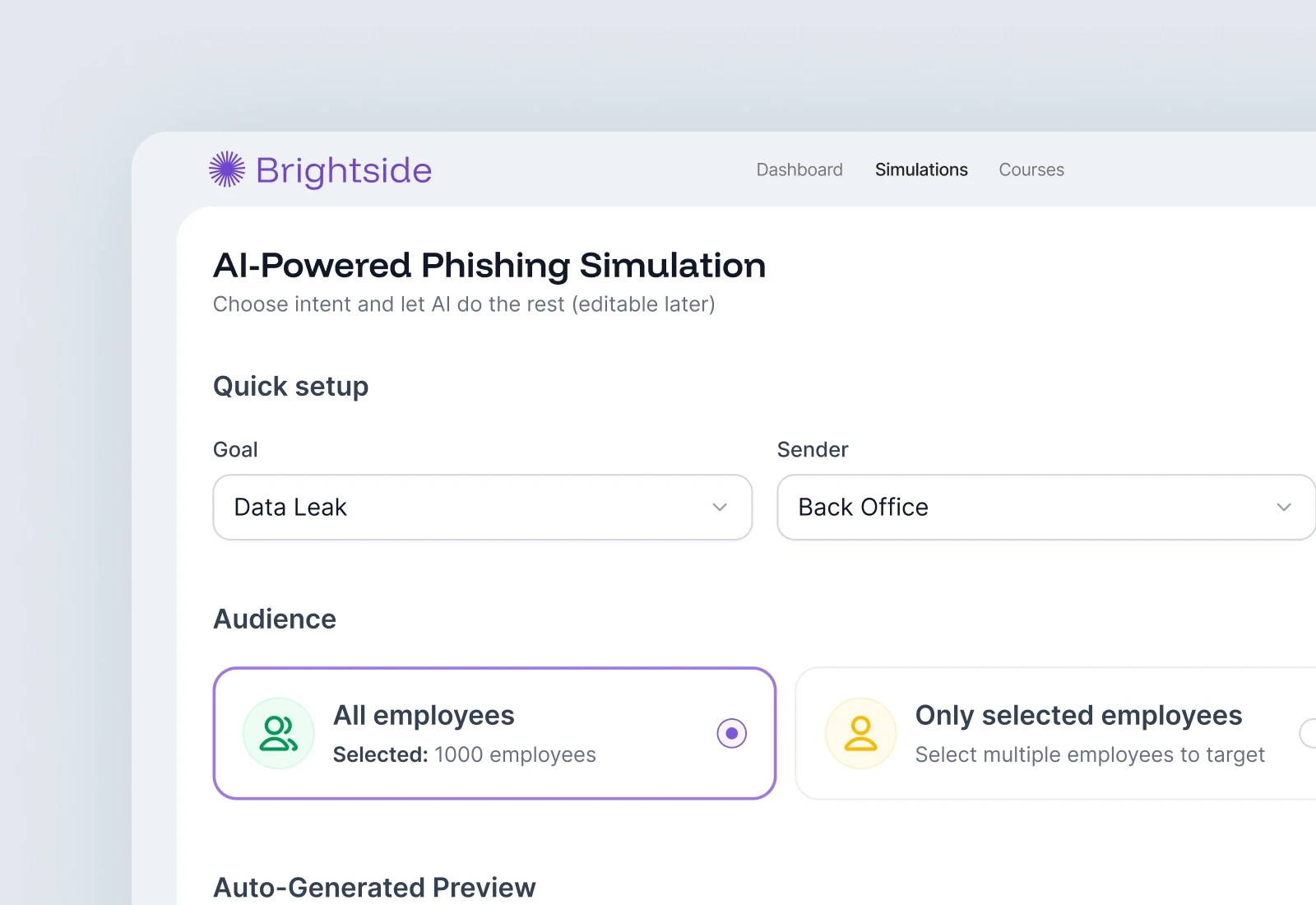 AI-generated phishing is 3.5 times more effective (according to Harvard research), letting criminals scale sophisticated social engineering. Brightside counters with AI simulations powered by OSINT, personalizing training to mirror the tactics targeting each employee.