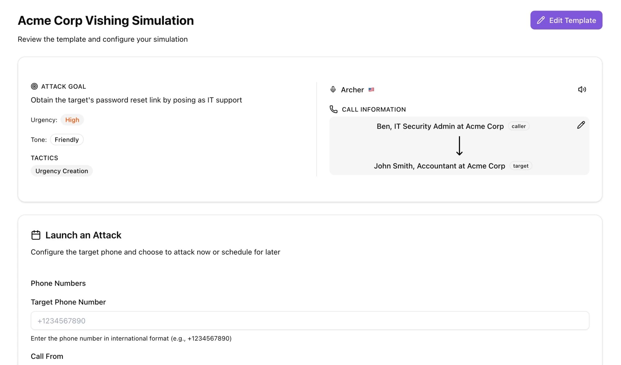 Yes. Admins have full control over the AI vishing simulator. You can auto-generate scenarios or manually configure caller personas, voice deepfakes, and specific social engineering tactics.
