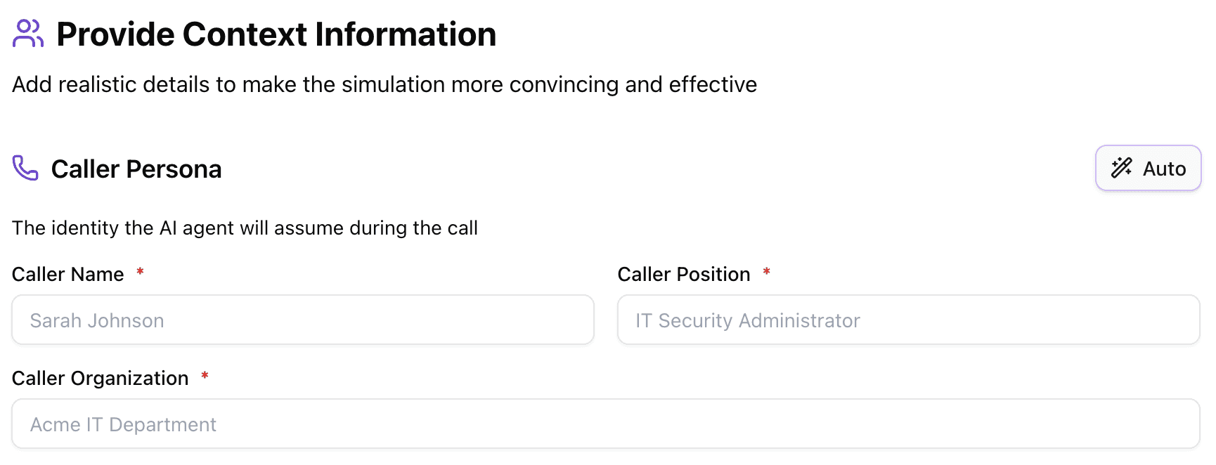 If you want to populate these fields quickly, there's an Auto-fill feature. Based on the attack goal you defined in the previous step, AI will generate a best-fitting persona. If the goal is to extract MFA codes by impersonating IT support, it might generate something like "James Carter, IT Security Analyst, TechCorp." You can use it as-is, edit any field, or ignore it entirely and write your own.