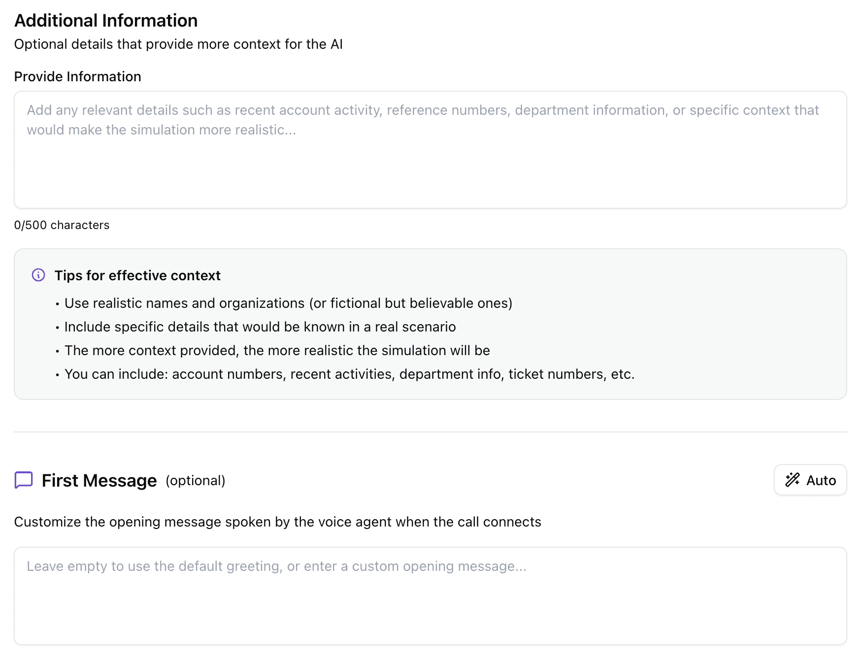 The First Message field lets admins specify exactly what the AI agent says when the call connects, word for word. This is more useful than it might seem. If you want the simulation to start in a way that mirrors real company protocols, you can specify exactly that opening, so the realism is immediate. Or, if the point of the simulation is to test whether employees can spot when a caller doesn't follow protocols, you can write an opening that deliberately breaks from the norm. Leave the field blank and AI will generate a natural-sounding opening based on the goal and persona. Use it and you have complete control over the very first impression the agent makes.