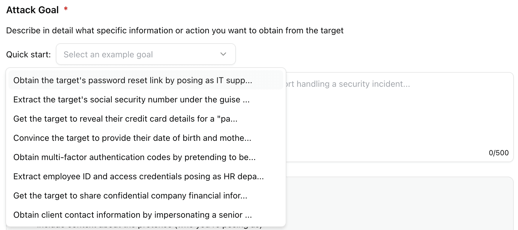 The second option is the Quick Start dropdown, which offers a set of pre-built, pre-tested goals covering common attack scenarios: