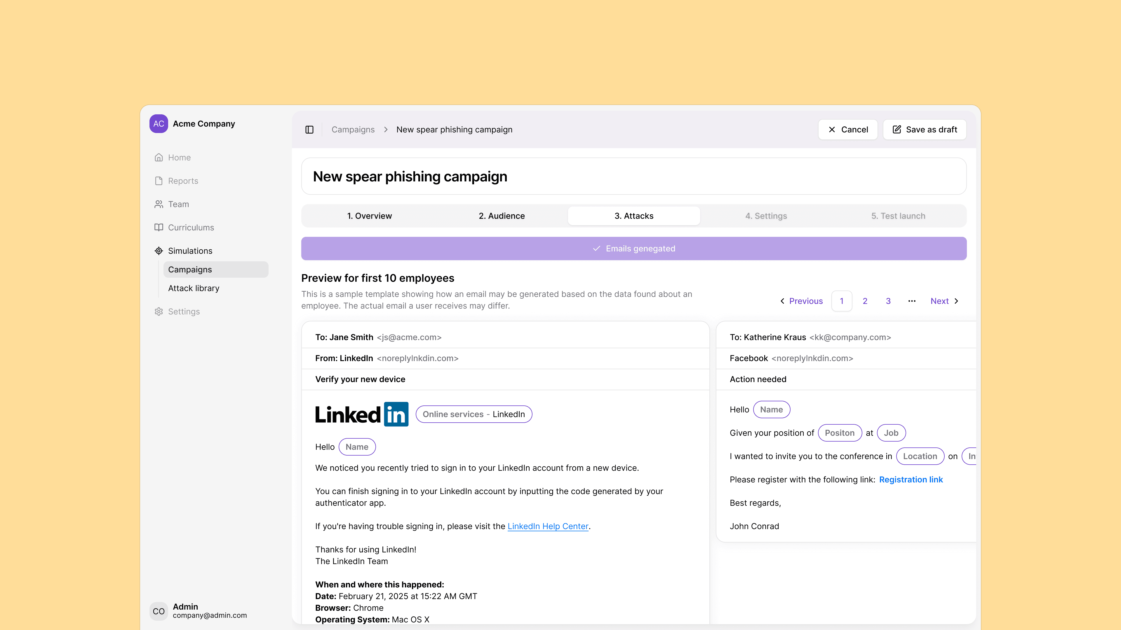 Save and launch: Save the template and immediately initiate the simulation campaign