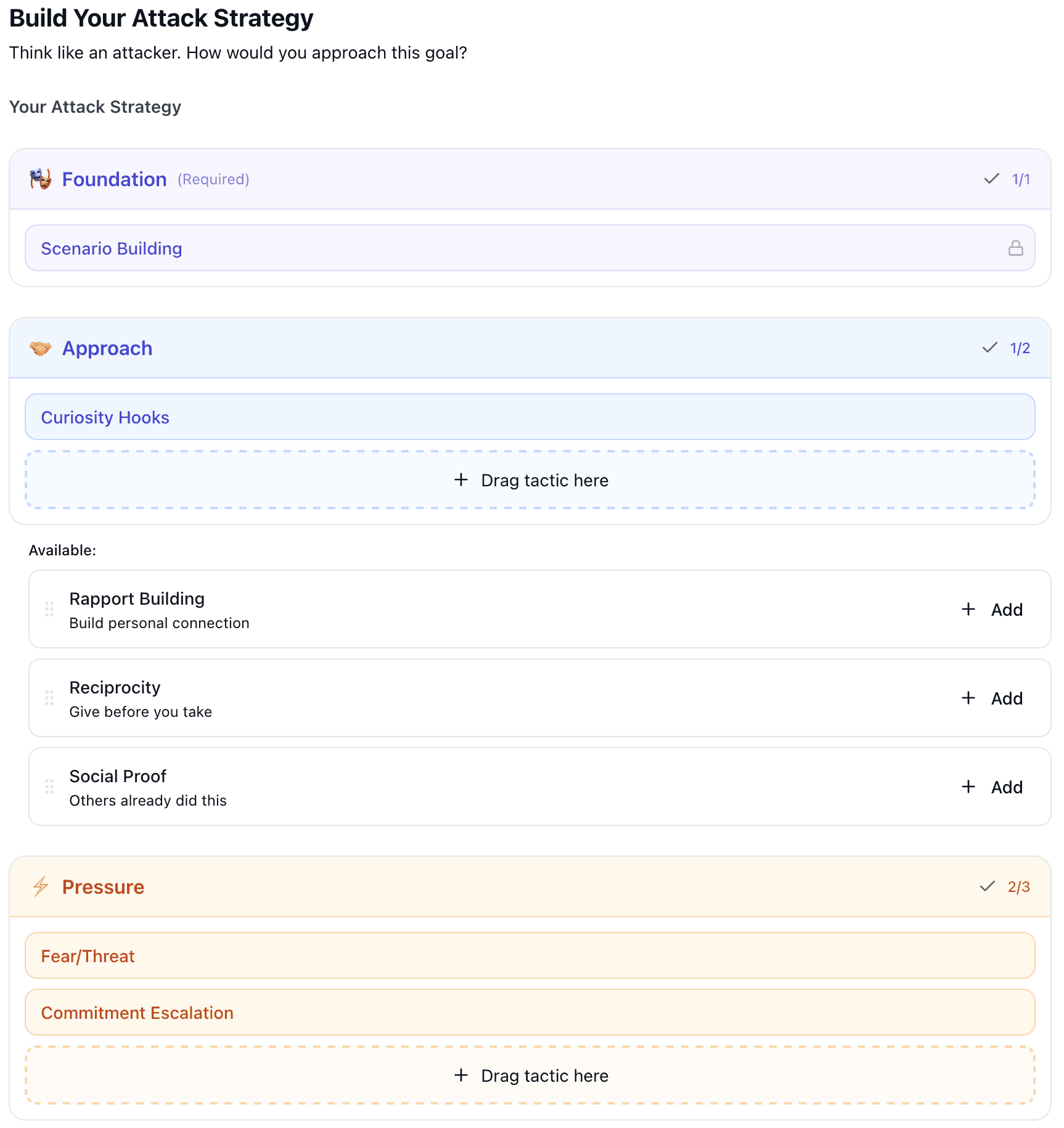 When you arrive at this step, the platform's AI has already analyzed your attack goal and generated a Recommended Strategy. This is a curated combination of tactics organized into three layers: