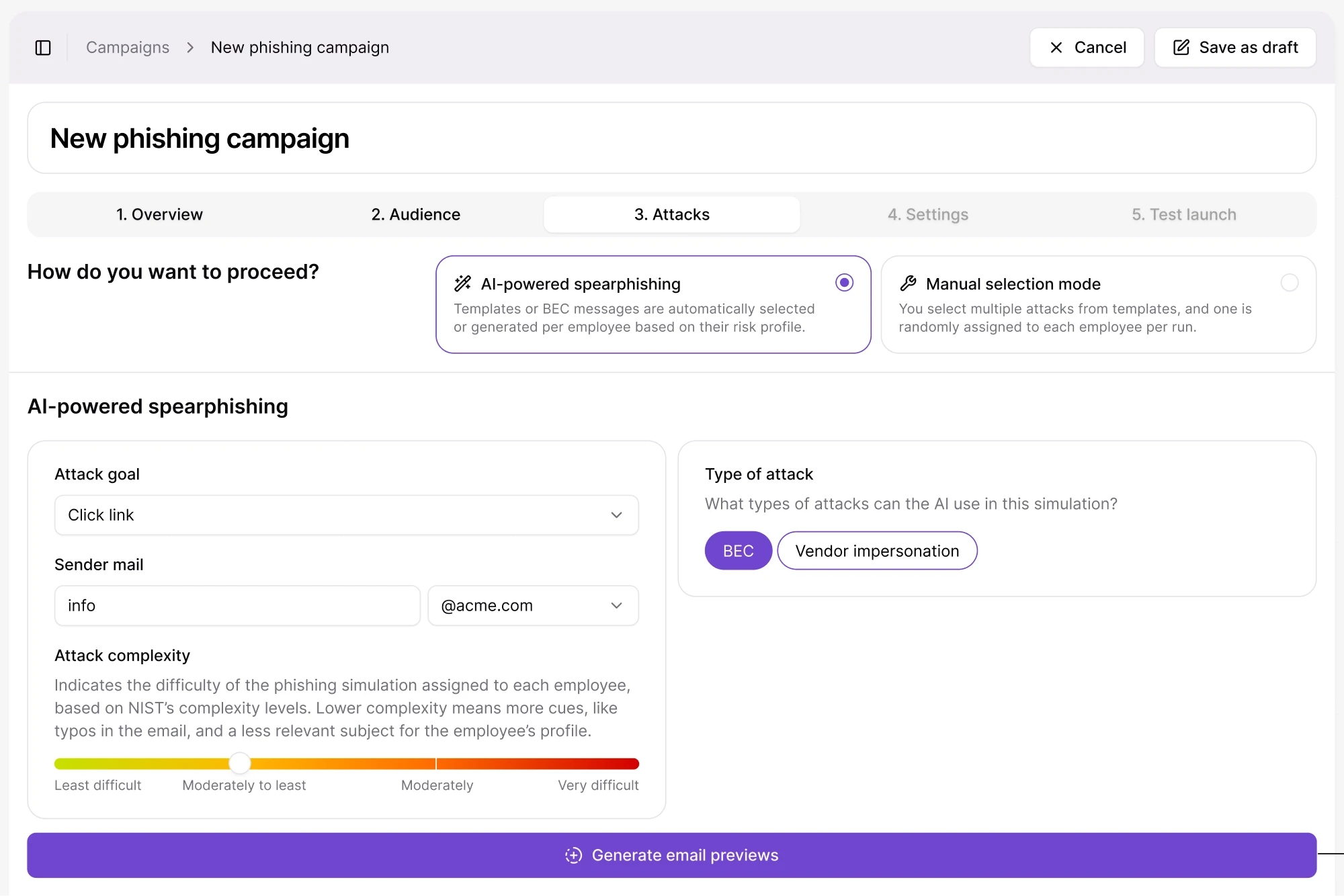 L'IA génère des attaques convaincantes adaptées au rôle, en exploitant le contexte des employé·es : intitulés de poste et outils quotidiens. Ajustez la difficulté de la sensibilisation basique au spear phishing avancé via le NIST Phish Scale.