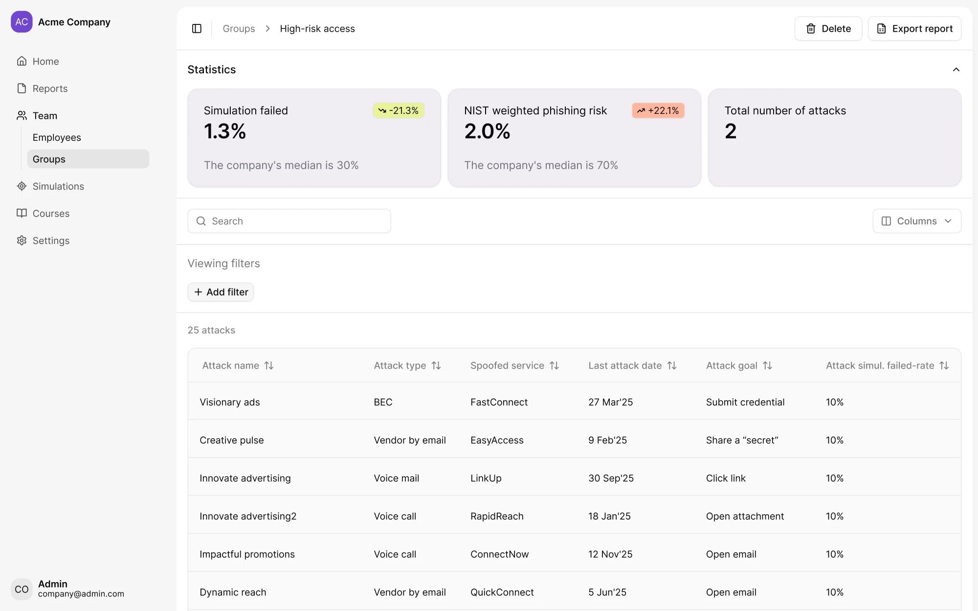 Nous fournissons des analyses de performance détaillées : taux de clics, saisies d'identifiants et délai de signalement. Vous pouvez suivre les évolutions comportementales dans le temps et consulter les scores de risque par département pour démontrer facilement le ROI de la sensibilisation à la sécurité auprès de vos parties prenantes.