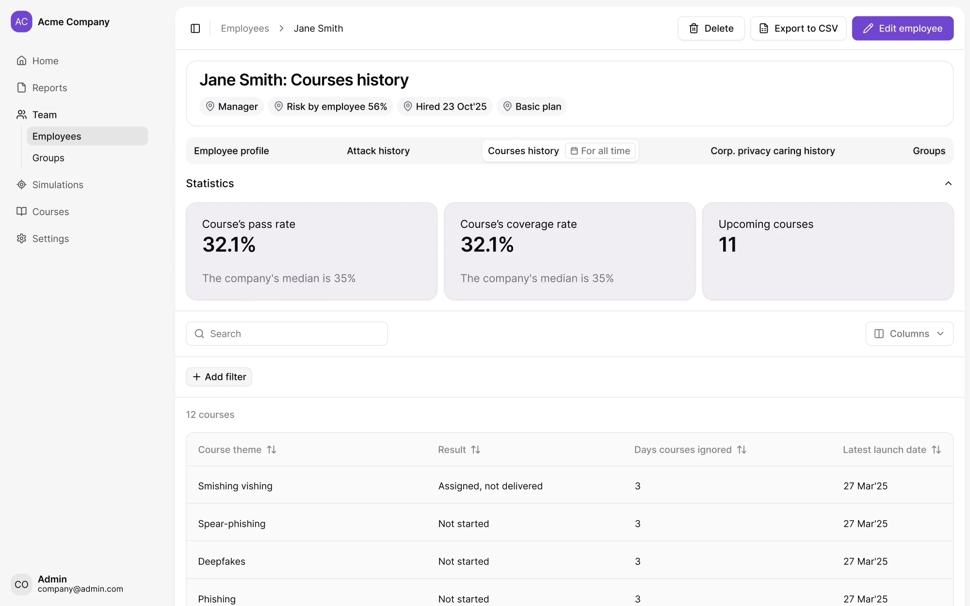 Nous fournissons des analyses de performance détaillées : taux de clics, saisies d'identifiants et délai de signalement. Vous pouvez suivre les évolutions comportementales dans le temps et consulter les scores de risque par département pour démontrer facilement le ROI de la sensibilisation à la sécurité auprès de vos parties prenantes.