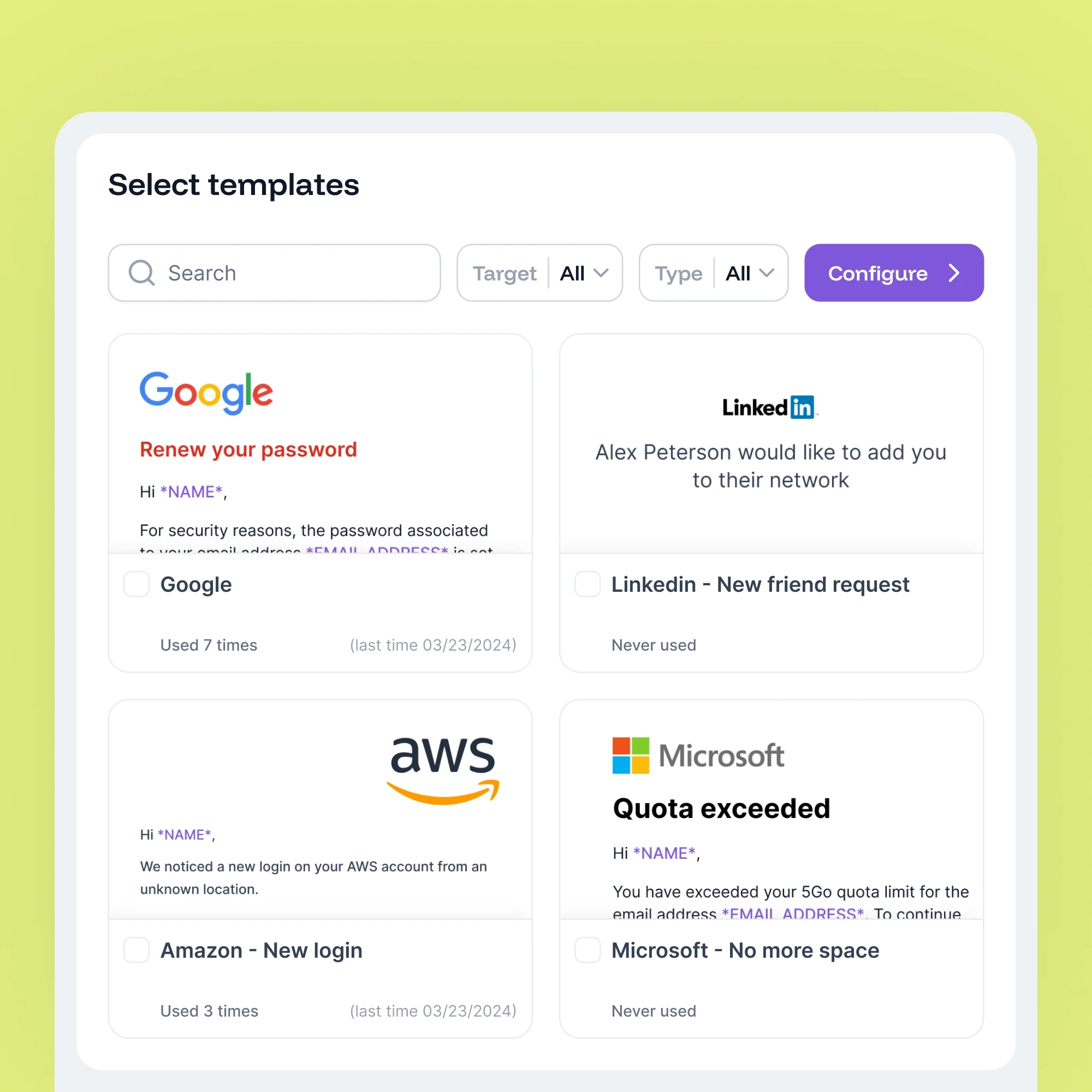 A comprehensive phishing template library organized by role and threat. Choose scenarios for credential theft, ransomware, financial fraud, and more to fit each department.